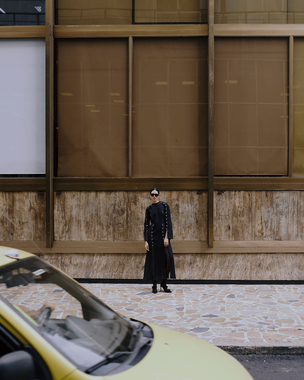 Las capas se convierten en una característica clave, con faldas que pueden usarse como salidas de baño o sobre pantalones para lograr un estilo audaz y contemporáneo. El vestido Martha surge como la pieza estrella de la colección, encarnando un espíritu futurista con guiños vintage de los años 80 y una fusión de minimalismo asiático con frescura mediterránea—expresando a la perfección las experiencias multiculturales de la fundadora de VYSH, Vanessa.