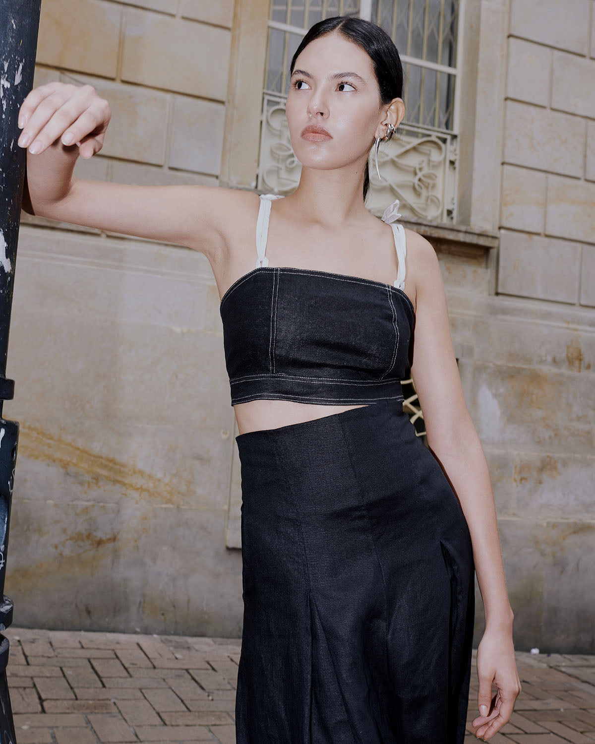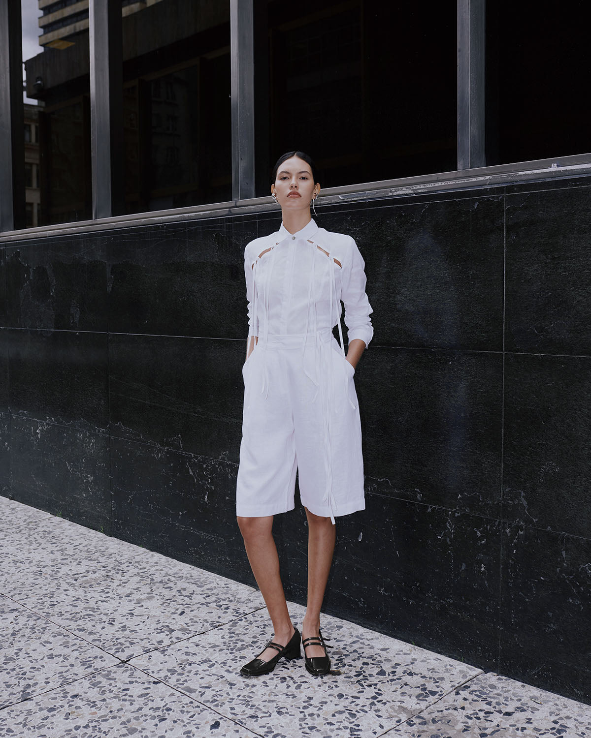La blusa EMI ejemplifica esta evolución: una pieza de tres colores con mangas desmontables, sin un frente o reverso definidos, y posibilidades infinitas de uso—una prenda que se transforma en múltiples looks, ofreciendo verdadera flexibilidad. Las minifaldas y los cierres innovadores con lazos naturales sustituyen los herrajes metálicos, manteniendo los diseños sostenibles y fáciles de ajustar. Las aberturas y tiras largas introducen movimiento fluido y una sensualidad sutil, demostrando que el lino puede ser divertido y moderno sin perder un aire elevado.