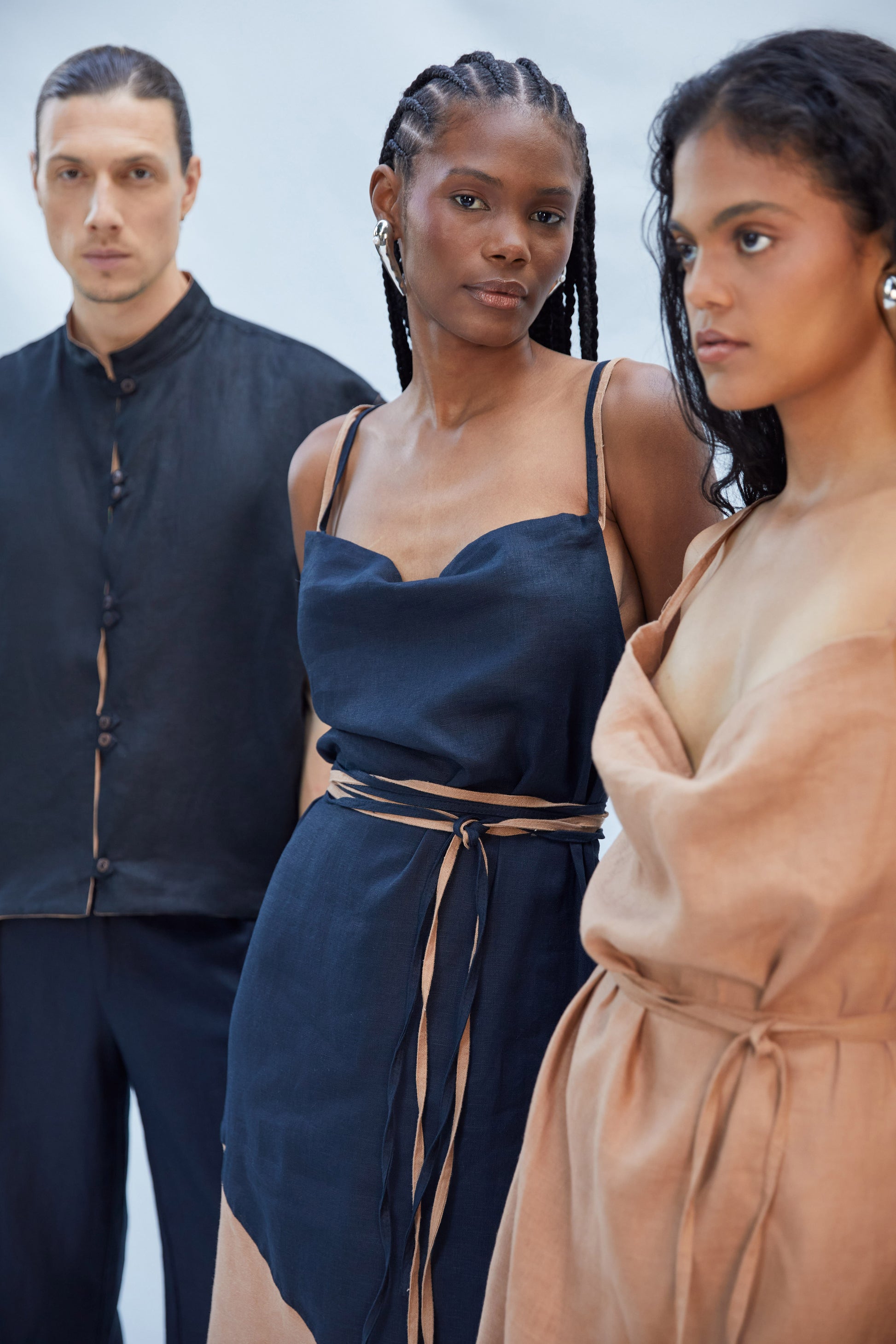 The ANDREA dress embodies contemporary femininity through movement, cut, and an intentional silhouette. Crafted from 100% natural linen, it features a cascading neckline and extra-long double straps that loop through the back, allowing them to be crossed and wrapped more than once around the waist. This design flatters the figure and fits seamlessly to the body.