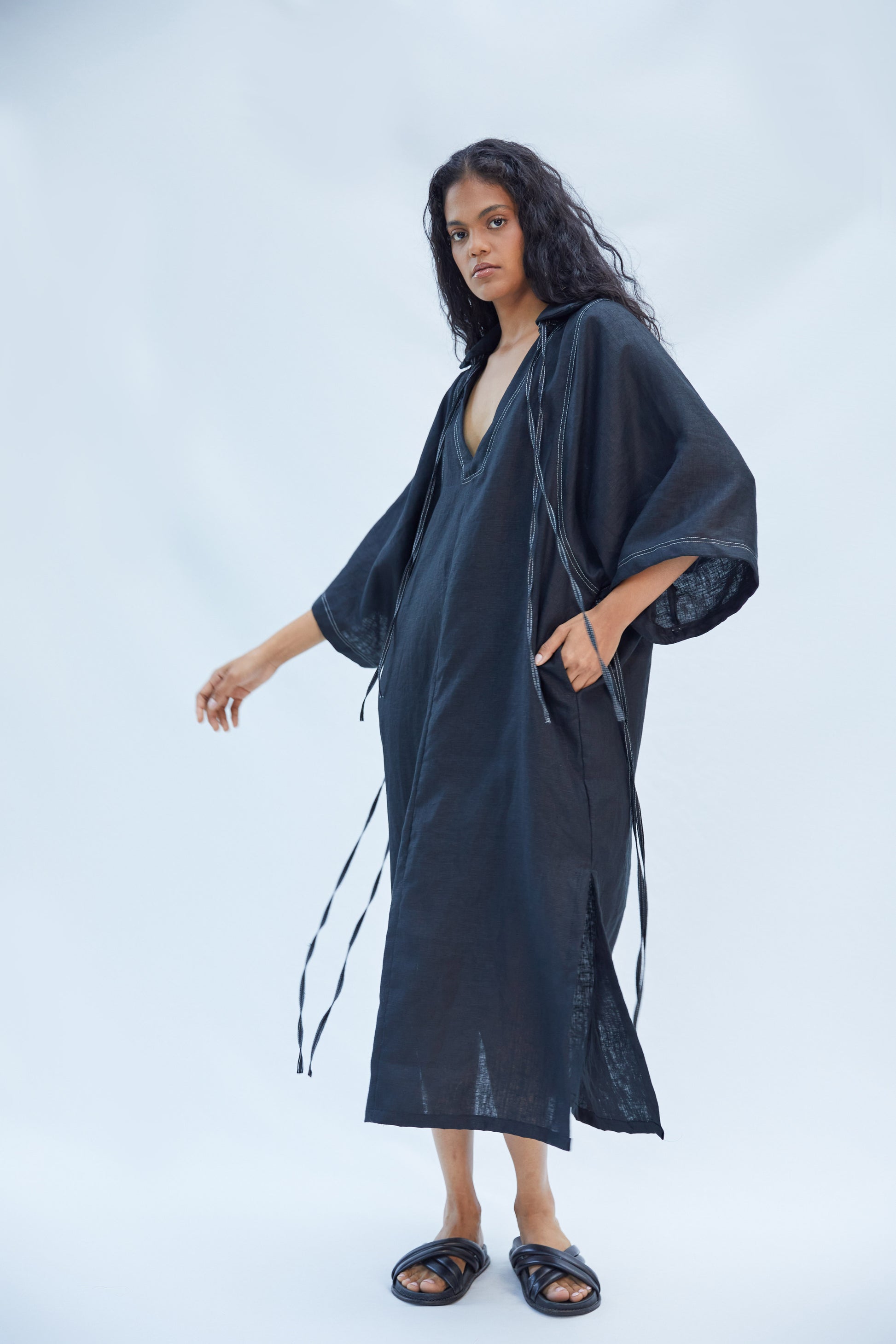 Its floor-length silhouette is breezy and unlined, with full sleeves and dropped shoulders that emphasize its sculptural drape. Deep side slits add freedom and allow it to flow naturally around the body. Designed to be worn alone, ISIS requires no layers—its presence is complete. It's a garment unique in its construction and symbolism, ideal for sacred rituals, coastal escapes, or any moment that demands clarity and intention.