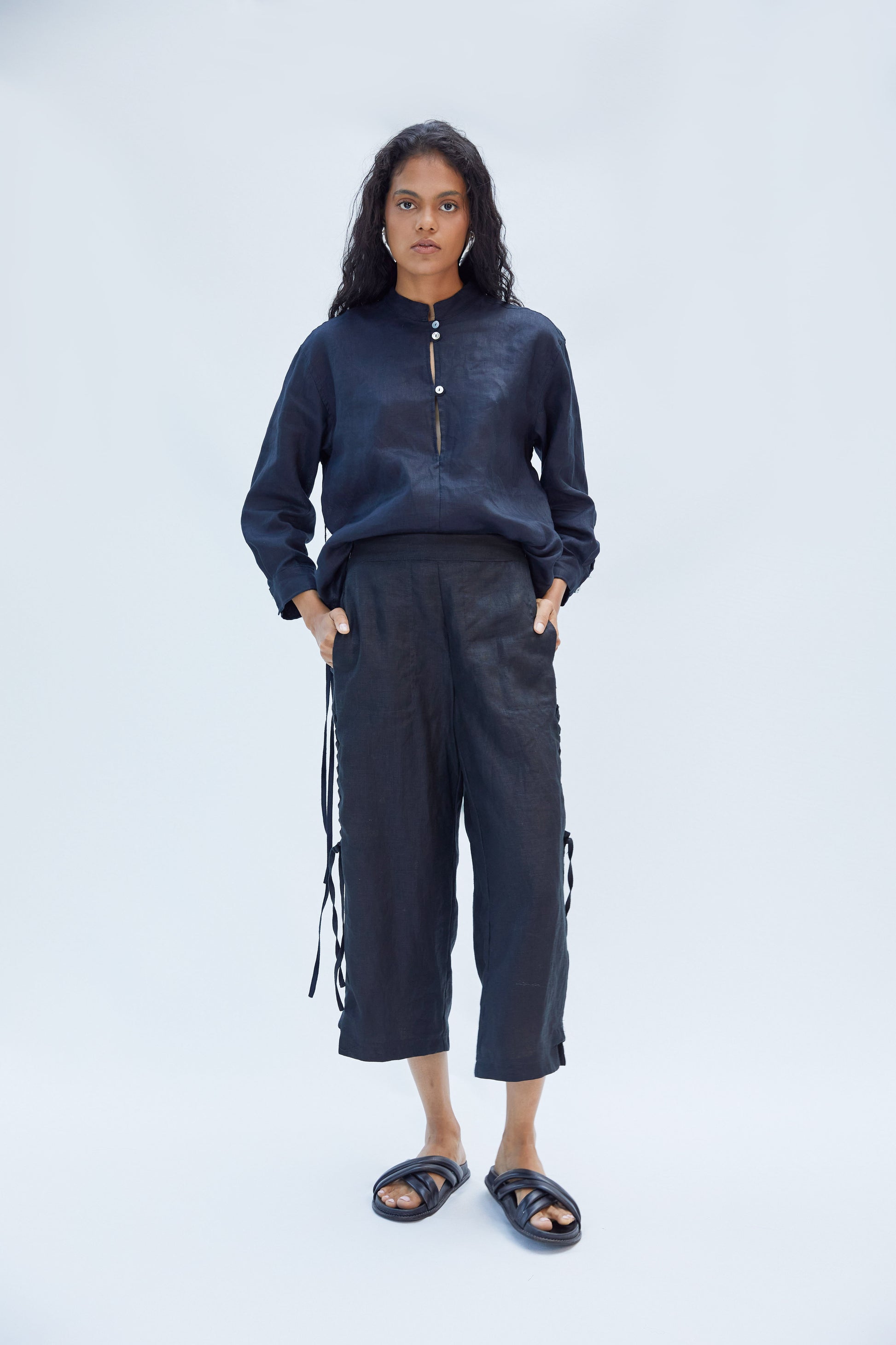 With a subtle nod to Asian tailoring, the NIA shirt features a clean Mao collar and three mother-of-pearl buttons down the front. Its silhouette is relaxed, with dropped shoulders and gently fitted sleeves that fall just above the wrist. The most striking detail is a hand-braided cord that runs through the lower back—an artisanal gesture that adds depth and texture, making the back a true focal point of the garment. This element reflects the brand's commitment to craftsmanship, transforming a minimalist design into a quietly striking piece.
