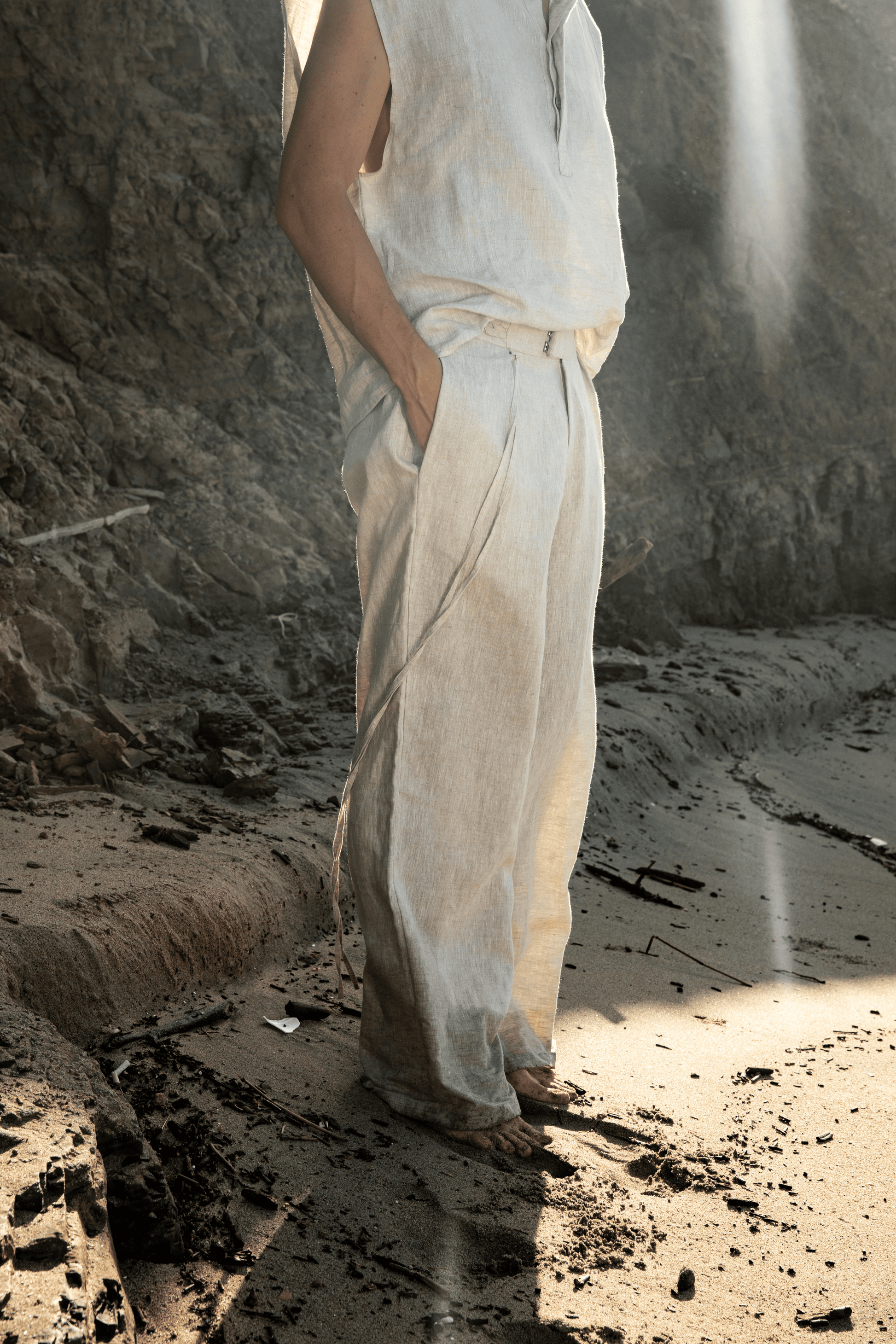 JULES es una reinterpretación contemporánea del pantalón sastre clásico, diseñado para hombres que valoran el diseño elevado y la artesanía. Su silueta presenta una pretina cruzada limpia, realzada por sutiles acentos trenzados a cada lado—un detalle hecho a mano que aporta una distinción silenciosa de VYSH. Un pequeño pasador en la cintura sostiene una cuerda XL decorativa y removible, que puede llevarse o no según la ocasión.