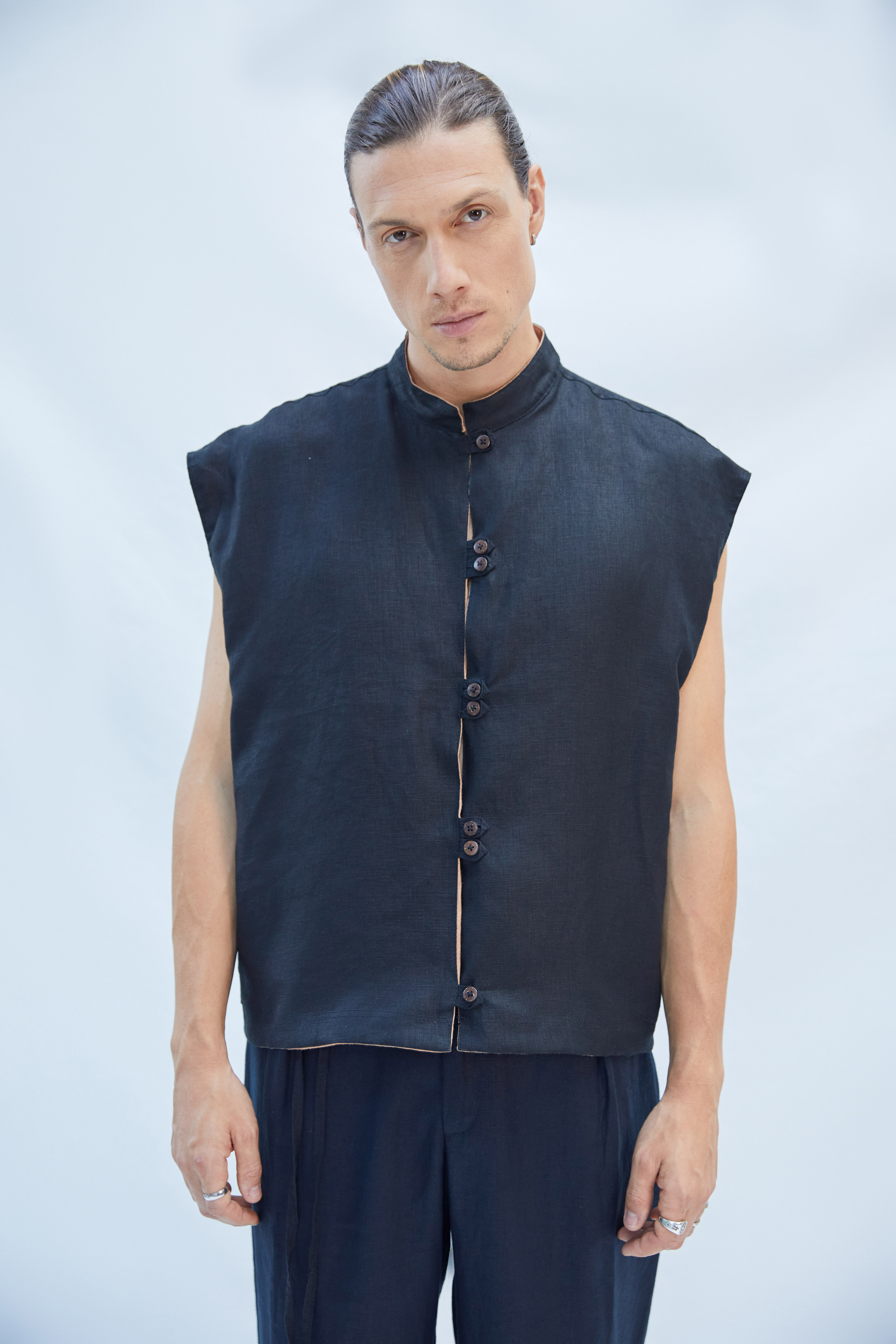 ROBBY es un chaleco reversible para hombre confeccionado en 100% lino natural, diseñado para ofrecer dos estilos distintos en una sola silueta oversize y audaz. El Lado A presenta tres bolsillos de parche—uno pequeño en el pecho y dos grandes en la parte inferior—además de pespuntes en contraste y un cierre con botones también en contraste que le dan un acabado gráfico y estructurado. El Lado B ofrece un diseño limpio, tono a tono, con bolsillos laterales funcionales, para una opción más discreta.
